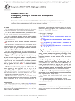 ASTM F1657/F1657M-96(2024) - Standard Practice for Emergency Joining of Booms with Incompatible Connectors establishes guidelines for the emergency connection of oil spill containment booms with non-matching connectors. Developed by ASTM International, this standard addresses practical needs for responders during spill incidents, when booms from different manufacturers or with various connector types must be joined for effective containment. The standard defines requirements and best practices, while acknowledging that the emergency joining may not guarantee maximum performance and may affect the tensile strength and effectiveness of the containment system.