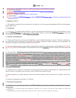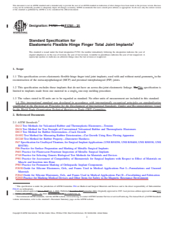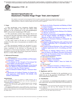 ASTM F1781-21 is a technical specification published by ASTM International. Its full title is "Standard Specification for Elastomeric Flexible Hinge Finger Total Joint Implants". This standard covers: ABSTRACT This specification covers the biocompatibility and other performance requirements, and associated test methods for elastomeric flexible hinge finger total joint implants, used with and without metal grommets in the reconstruction of the metacarpophalangeal (MCP) and proximal interphalangeal (PIP) joints. This specification excludes those implants that do not have an across-the-joint elastomeric linkage, and is limited to implants made from one material in a single one-step molding procedure. SCOPE 1.1 This specification covers elastomeric flexible hinge finger total joint implants, used with and without metal grommets, in the reconstruction of the metacarpophalangeal (MCP) and proximal interphalangeal (PIP) joints. 1.2 This specification excludes those implants that do not have an across-the-joint elastomeric linkage. This specification is limited to implants made from one material in a single, one-step molding procedure. 1.3 The values stated in SI units are to be regarded as standard. No other units of measurement are included in this standard. 1.4 This international standard was developed in accordance with internationally recognized principles on standardization established in the Decision on Principles for the Development of International Standards, Guides and Recommendations issued by the World Trade Organization Technical Barriers to Trade (TBT) Committee.