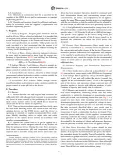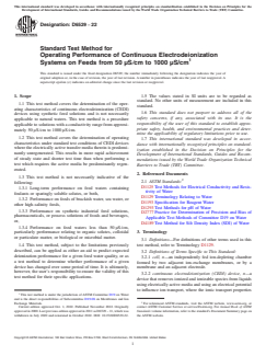 SIGNIFICANCE AND USE 5.1 The CEDI devices can be used to produce deionized water from feeds of pretreated water. This test method permits the relatively rapid measurement of key performance capabilities of CEDI devices using standard sets of conditions. The data obtained can be analyzed to provide information on whether changes may have occurred in operating characteristics of the device independently of any variability in feed water characteristics or operating conditions. Under specific circumstances, this test method may also provide sufficient information for plant design. SCOPE 1.1 This test method covers the determination of the operating characteristics of continuous electrodeionization (CEDI) devices using synthetic feed solutions and is not necessarily applicable to natural waters. This test method is a procedure applicable to solutions with a conductivity range from approximately 50 μS/cm to 1000 μS/cm. 1.2 This test method covers the determination of operating characteristics under standard test conditions of CEDI devices where the electrically active transfer media therein is predominantly unregenerated. This results in more rapid achievement of steady state and shorter test time than when performing a test which requires the active media be predominantly regenerated. 1.3 This test method is not necessarily indicative of the following: 1.3.1 Long-term performance on feed waters containing foulants or sparingly soluble solutes, or both, 1.3.2 Performance on feeds of brackish water, sea water, or other high-salinity feeds, 1.3.3 Performance on synthetic industrial feed solutions, pharmaceuticals, or process solutions of foods and beverages, or, 1.3.4 Performance on feed waters less than 50 μS/cm, particularly performance relating to organic solutes, colloidal or particulate matter, or biological or microbial matter. 1.4 This test method, subject to the limitations previously described, can be applied as either an aid to predict expected deionization performance for a given feed water quality, or as a test method to determine whether performance of a given device has changed over some period of time. It is ultimately, however, the user's responsibility to ensure the validity of this test method for their specific applications. 1.5 The values stated in SI units are to be regarded as standard. No other units of measurement are included in this standard. 1.6 This standard does not purport to address all of the safety concerns, if any, associated with its use. It is the responsibility of the user of this standard to establish appropriate safety, health, and environmental practices and determine the applicability of regulatory limitations prior to use. 1.7 This international standard was developed in accordance with internationally recognized principles on standardization established in the Decision on Principles for the Development of International Standards, Guides and Recommendations issued by the World Trade Organization Technical Barriers to Trade (TBT) Committee.