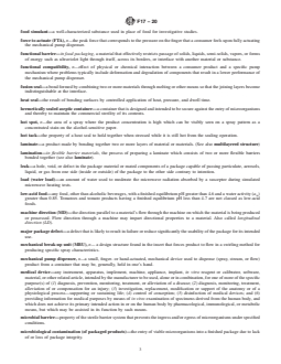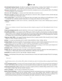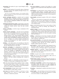 ASTM F17-20 is a standard published by ASTM International. Its full title is "Standard Terminology Relating to Primary Barrier Packaging". This standard covers: SCOPE 1.1 This terminology covers the principal terms relating to primary barrier packaging and its materials. This terminology contains related definitions and descriptions of terms used or likely to be used in primary barrier packaging standards. The purpose of terminology is to promote clear understanding and interpretation of the standards in which they are used. 1.2 This international standard was developed in accordance with internationally recognized principles on standardization established in the Decision on Principles for the Development of International Standards, Guides and Recommendations issued by the World Trade Organization Technical Barriers to Trade (TBT) Committee.