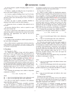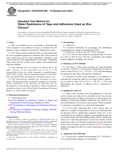 SIGNIFICANCE AND USE 5.1 When a box becomes wet, the performance of the box and its closure are reduced. It is desirable to have box closure methods that retain an ability to keep the box closed when wet. Sealing or reinforcing methods sometimes are useful to improve performance of wet boxes and closures. Water resistance is sometimes a regulatory or contractual requirement. 5.2 A test result indicating that a box closure tape or adhesive is soluble or dispersible in water is an indication that its function will be significantly impaired when wet. A test result that does not indicate solubility or dispersibility does not necessarily ensure that the bonding ability will be satisfactory when wet or that the performance of the box closure will be satisfactory when wet. Package performance testing described in the water resistance section of Practice D1974 is useful to further investigate the effects of water on package and closure functions. SCOPE 1.1 This test method covers a procedure to determine the water resistance of an adhesive or tape as measured by the amount of tape or adhesive dissolved or dispersed in water. 1.2 The values stated in either SI units or inch-pound units are to be regarded separately as standard. The values stated in each system may not be exact equivalents; therefore, each system shall be used independently of the other. Combining values from the two systems may result in non-conformance with the standard. 1.3 This standard does not purport to address all of the safety concerns, if any, associated with its use. It is the responsibility of the user of this standard to establish appropriate safety, health, and environmental practices and determine the applicability of regulatory limitations prior to use. 1.4 This international standard was developed in accordance with internationally recognized principles on standardization established in the Decision on Principles for the Development of International Standards, Guides and Recommendations issued by the World Trade Organization Technical Barriers to Trade (TBT) Committee.