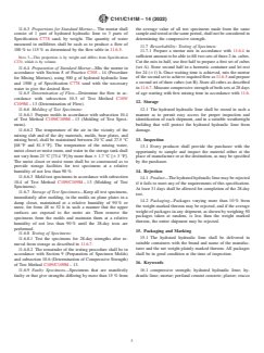 ASTM C141/C141M-14(2022) is a technical specification published by ASTM International. Its full title is "Standard Specification for Hydrated Hydraulic Lime for Structural Purposes". This standard covers: ABSTRACT This specification covers hydraulic hydrated lime for structural purposes. Hydraulic hydrated lime may be used in the scratch or brown coat of plaster, stucco, mortar, or in Portland-cement concrete either as blend, amendment, or admixture. The hydraulic hydrated lime shall conform to the chemical composition requirements for calcium oxide, magnesium oxide, silica, iron oxide, aluminum oxide, and carbon dioxide. The sample shall be subjected to the following test methods: chemical analysis; fineness; normal consistency; time of setting; autoclave expansion; and compressive strength. SCOPE 1.1 This specification covers hydrated hydraulic lime for structural purposes. 1.2 Hydrated hydraulic lime may be used in the scratch or brown coat of plaster, stucco, mortar, or in portland-cement concrete either as blend, amendment, or admixture. 1.3 The values stated in either SI units or inch-pound units are to be regarded separately as standard. Within the text, the inch-pound units are shown in brackets. The values stated in each system may not be exact equivalents; therefore, each system shall be used independently of the other. Combining values from the two systems may result in non-conformance with the standard. 1.4 The following precautionary caveat pertains only to the test method portion, Section 11 of this specification: This standard does not purport to address all of the safety concerns, if any, associated with its use. It is the responsibility of the user of this standard to establish appropriate safety, health, and environmental practices and determine the applicability of regulatory limitations prior to use. 1.5 This international standard was developed in accordance with internationally recognized principles on standardization established in the Decision on Principles for the Development of International Standards, Guides and Recommendations issued by the World Trade Organization Technical Barriers to Trade (TBT) Committee.