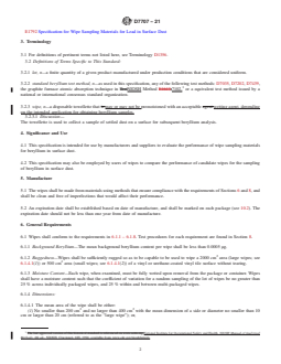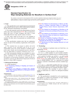 ASTM D7707-21 is a technical specification published by ASTM International. Its full title is "Standard Specification for Wipe Sampling Materials for Beryllium in Surface Dust". This standard covers: SCOPE 1.1 This specification covers requirements for premoistened wipe materials that are used to collect settled dusts on surfaces for the subsequent determination of beryllium. 1.2 For wipe materials used for the determination of lead in surface dust, refer to Specification E1792. This is mentioned to insure that users of wipes recognize that there is some relationship between wipes and the analyte of interest. 1.3 The values stated in SI units are to be regarded as standard. No other units of measurement are included in this standard. 1.4 This specification contains notes that are explanatory and are not part of the mandatory requirements of the specification. 1.5 This standard does not purport to address all of the safety concerns, if any, associated with its use. It is the responsibility of the user of this standard to establish appropriate safety, health, and environmental practices and determine the applicability of regulatory limitations prior to use. 1.6 This international standard was developed in accordance with internationally recognized principles on standardization established in the Decision on Principles for the Development of International Standards, Guides and Recommendations issued by the World Trade Organization Technical Barriers to Trade (TBT) Committee.