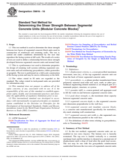 SIGNIFICANCE AND USE 5.1 The shear strength between segmental concrete units (with and without geosynthetic reinforcement) is used in design of reinforced soil retaining walls. 5.2 This test is used to determine the shear strength for the design of the facing stability of segmental retaining walls. Performing a series of these shear tests at varying normal loads permits development of a relationship between shear strength and normal load. This relationship may be linear, bilinear, or some other complex mathematical expression. 5.3 This shear strength test is meant to be a performance test (laboratory or field); therefore, it should be conducted using full-scale system components. The conditions for the test are selected by the user and are not for routine testing. 5.4 As a performance test on full-scale system components, it accounts for some of the variables in construction procedures and materials tolerance normally present for these types of retaining wall systems. SCOPE 1.1 This test method is used to determine the shear strength between two layers of segmental concrete block units used in construction of reinforced soil retaining walls. The test is carried out under conditions determined by the user that reproduce the facing system at full scale. The results of a series of tests are used to define a relationship between shear strength developed between segmental concrete units and normal load. 1.2 This is a performance test used to determine properties for design of retaining wall systems utilizing segmental concrete units and soil reinforcing geosynthetics, either geotextiles or geogrids. The test is performed on a full-scale construction of the facing system and may be run in a laboratory or the field. 1.3 The values stated in SI units are regarded as the standard. The values stated in inch-pound units are provided for information only. 1.4 This standard does not purport to address all of the safety concerns, if any, associated with its use. It is the responsibility of the user of this standard to establish appropriate safety, health, and environmental practices and determine the applicability of regulatory limitations prior to use. 1.5 This international standard was developed in accordance with internationally recognized principles on standardization established in the Decision on Principles for the Development of International Standards, Guides and Recommendations issued by the World Trade Organization Technical Barriers to Trade (TBT) Committee.