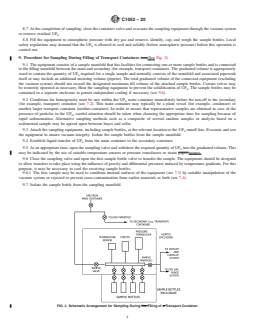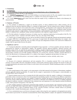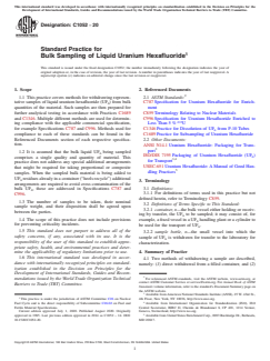 SIGNIFICANCE AND USE 5.1 Uranium hexafluoride is normally produced and handled in large (typically 1- to 20-ton) quantities and must, therefore, be characterized by reference to representative samples. The quantities involved, physical properties, chemical reactivity, and hazardous nature of UF6 are such that for representative sampling, specially designed equipment must be used and operated in accordance with the most carefully controlled and stringent procedures. This practice indicates appropriate principles, equipment, and procedures currently in use for bulk sampling of liquid UF6. It is used by UF6 converters, enrichers, and fuel fabricators to review the effectiveness of existing procedures or as a guide to the design of equipment and procedures for future use. 5.2 It is emphasized that this practice is not meant to address conventional or nuclear criticality safety issues. SCOPE 1.1 This practice covers methods for withdrawing representative samples of liquid uranium hexafluoride (UF6) from bulk quantities of the material. Such samples are then prepared for further analytical testing in accordance with Practices C1689 and C1346. Multiple different methods are used for determining compliance with the applicable commercial specification, for example Specifications C787 and C996. Methods used for compliance to each of these standards can be found in the Referenced Documents section of each respective specification. 1.2 It is assumed that the bulk liquid UF6 being sampled comprises a single quality and quantity of material. This practice does not address any special additional arrangements that might be required for taking proportional or composite samples. When the sampled bulk material is being added to UF6 residues already in a container (“heels recycle”) additional arrangements are required to avoid cross contamination of the bulk UF6, these are addressed in Specifications C787 and C996. 1.3 The number of samples to be taken, their nominal sample weight, and their disposition shall be agreed upon between the parties. 1.4 The scope of this practice does not include provisions for preventing criticality incidents. 1.5 This standard does not purport to address all of the safety concerns, if any, associated with its use. It is the responsibility of the user of this standard to establish appropriate safety, health, and environmental practices and determine the applicability of regulatory limitations prior to use. 1.6 This international standard was developed in accordance with internationally recognized principles on standardization established in the Decision on Principles for the Development of International Standards, Guides and Recommendations issued by the World Trade Organization Technical Barriers to Trade (TBT) Committee.