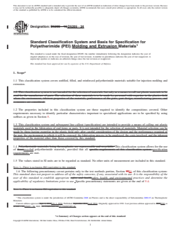 ABSTRACT This classification system covers unfilled, filled, and reinforced polyetherimide materials suitable for injection molding and extrusion. Unfilled polyetherimide materials are classified into groups according to their composition. These groups are subdivided into classes and grades. The plastic compositions shall be uniform and shall conform to the requirements specified. Determine the properties enumerated in this classification system using the referenced test methods. SCOPE 1.1 This classification system covers unfilled, filled, and reinforced polyetherimide materials suitable for injection molding and extrusion. 1.2 The properties included in this classification system are those required to identify the compositions covered. Other requirements necessary to identify particular characteristics important to specialized applications are to be specified by using suffixes as given in Section 5. 1.3 This classification system and subsequent line callout (specification) are intended to provide a means of calling out plastic materials used in the fabrication of end items or parts. It is not intended for the selection of materials. Material selection can be made by those having expertise in the plastic field only after careful consideration of the design and the performance required of the part, the environment to which it will be exposed, the fabrication process to be employed, the costs involved, and the inherent properties of the material other than those covered by this standard. 1.4 This classification system allows for the use of recycled polyetherimide materials, provided that all specification requirements are met. 1.5 The values stated in SI units are to be regarded as standard. No other units of measurement are included in this standard. Note 1: There is no known ISO equivalent to this standard. 1.6 The following precautionary caveat pertains only to the test methods portion, Section 11, of this classification system: This standard does not purport to address all of the safety concerns, if any, associated with its use. It is the responsibility of the user of this standard to establish appropriate safety, health, and environmental practices and determine the applicability of regulatory limitations prior to use. Specific precautionary statements are given at the end of 5.4. 1.7 This international standard was developed in accordance with internationally recognized principles on standardization established in the Decision on Principles for the Development of International Standards, Guides and Recommendations issued by the World Trade Organization Technical Barriers to Trade (TBT) Committee.