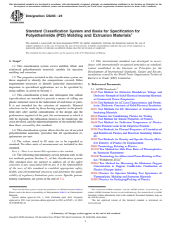 ASTM D5205-24 is a technical specification published by ASTM International. Its full title is "Standard Classification System and Basis for Specification for Polyetherimide (PEI) Molding and Extrusion Materials". This standard covers: ABSTRACT This classification system covers unfilled, filled, and reinforced polyetherimide materials suitable for injection molding and extrusion. Unfilled polyetherimide materials are classified into groups according to their composition. These groups are subdivided into classes and grades. The plastic compositions shall be uniform and shall conform to the requirements specified. Determine the properties enumerated in this classification system using the referenced test methods. SCOPE 1.1 This classification system covers unfilled, filled, and reinforced polyetherimide materials suitable for injection molding and extrusion. 1.2 The properties included in this classification system are those required to identify the compositions covered. Other requirements necessary to identify particular characteristics important to specialized applications are to be specified by using suffixes as given in Section 5. 1.3 This classification system and subsequent line callout (specification) are intended to provide a means of calling out plastic materials used in the fabrication of end items or parts. It is not intended for the selection of materials. Material selection can be made by those having expertise in the plastic field only after careful consideration of the design and the performance required of the part, the environment to which it will be exposed, the fabrication process to be employed, the costs involved, and the inherent properties of the material other than those covered by this standard. 1.4 This classification system allows for the use of recycled polyetherimide materials, provided that all specification requirements are met. 1.5 The values stated in SI units are to be regarded as standard. No other units of measurement are included in this standard. Note 1: There is no known ISO equivalent to this standard. 1.6 The following precautionary caveat pertains only to the test methods portion, Section 11, of this classification system: This standard does not purport to address all of the safety concerns, if any, associated with its use. It is the responsibility of the user of this standard to establish appropriate safety, health, and environmental practices and determine the applicability of regulatory limitations prior to use. Specific precautionary statements are given at the end of 5.4. 1.7 This international standard was developed in accordance with internationally recognized principles on standardization established in the Decision on Principles for the Development of International Standards, Guides and Recommendations issued by the World Trade Organization Technical Barriers to Trade (TBT) Committee.