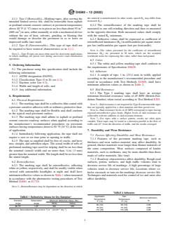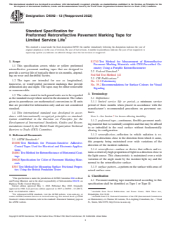 ASTM D4592-12(2022) is a technical specification published by ASTM International. Its full title is "Standard Specification for Preformed Retroreflective Pavement Marking Tape for Limited Service Life". This standard covers: ABSTRACT This specification covers white or yellow preformed retroreflective pavement marking tapes that are designed to provide a service life of typically 3 to 6 months, on roads with up to 15 000 average daily traffic count (ADT). The tapes are intended for use as longitudinal, transverse, or word/symbol pavement markings that provide delineation day and night. The tapes may be either Type I (removable) or Type II (nonremovable). The marking tape shall be a reflective film coated with a pressure-sensitive adhesive with or without a protective liner. It shall be flexible and shall conform to the the typical road pavement surface. In addition, it shall adhere to asphalt or portland cement concrete roadway surfaces when applied. Also, the marking tape shall be retroreflective, reflecting white or yellow, respectively, and shall be readily visible when viewed with automobile headlights at night and shall have minimum reflective values as specified. SCOPE 1.1 This specification covers white or yellow preformed retroreflective pavement marking tapes that are designed to provide a service life of typically three to six months, depending on wear and durability factors. 1.2 The tapes are intended for use as longitudinal, transverse, or word/symbol pavement markings that provide delineation day and night. The tapes may be either removable or nonremovable. 1.3 The values stated in inch-pound units are to be regarded as the standard except where noted in the document. The values given in parentheses are mathematical conversions to SI units that are provided for information only and are not considered standard. 1.4 This international standard was developed in accordance with internationally recognized principles on standardization established in the Decision on Principles for the Development of International Standards, Guides and Recommendations issued by the World Trade Organization Technical Barriers to Trade (TBT) Committee.