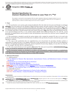 ASTM C996-20: Standard Specification for Uranium Hexafluoride Enriched to Less Than 5% 235U is an internationally recognized standard developed by ASTM International. This specification covers nuclear-grade uranium hexafluoride (UF₆) with 235U concentrations below 5%, intended primarily for use in nuclear fuel fabrication. The document defines the impurity and uranium isotope limits for both enriched commercial grade UF₆ and enriched reprocessed UF₆, aiming to ensure material consistency, safety, and suitability for nuclear fuel manufacturing processes.