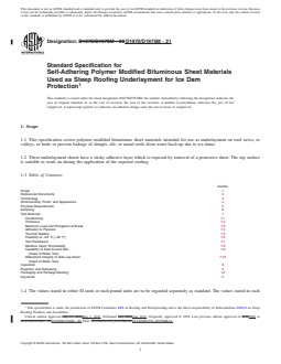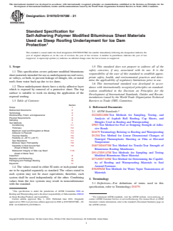 1.1 This specification covers polymer modified bituminous sheet materials intended for use as underlayment on roof eaves, or valleys, or both, to prevent leakage of shingle, tile, or metal roofs from water back-up due to ice dams.