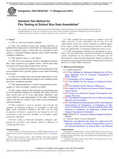 SIGNIFICANCE AND USE 5.1 In this test method fire test response characteristics of a school bus seat assembly are assessed following ignition by a square gas burner. 5.2 This test method is similar in concept to a fire test currently used, and which has been in such use for many years, as the industry standard for flammability testing of school bus seats (see Appendix X1). However, in this test method the paper bag has been replaced by a gas burner as the ignition source. 5.3 The US federal government has issued a flammability test applicable to interior materials in road vehicles, FMVSS 302. FMVSS 302 remains the only regulatory test for assessing fire-test-response characteristics of school bus seats. 5.4 ASTM has issued Test Method D5132 in order to provide a more standardized way of conducting FMVSS 302. 5.5 The test method described in this document provides a significantly higher challenge to school bus seats than the FMVSS 302 federal regulatory test. Therefore, any seat assembly that performs acceptably in this test is likely to meet the requirements of FMVSS 302. 5.6 It is clear that those seat assemblies that exhibit little or no flame spread, short times to flame extinction and little mass loss in this test are likely to exhibit improved performance in an actual fire situation compared to seat assemblies that burn vigorously and have high mass loss. 5.7 This test is primarily useful to distinguish products that, when exposed to these fire conditions, will become fully involved in fire from other products that will not. SCOPE 1.1 This is a fire-test-response standard. 1.2 This test method assesses the burning behavior of upholstered seating used in school buses by measuring specific fire-test responses when a school bus seat specimen is subjected to a specified flaming ignition source under normally ventilated conditions. 1.3 The ignition source is a gas burner. 1.4 This fire test is primarily useful to distinguish products that, when exposed to an ignition source, will become fully involved in fire from other products that will not. 1.5 Data are obtained describing the burning behavior of the seat assemblies from a specific ignition source until all burning has ceased. 1.6 This test method does not provide information on the fire performance of upholstered seating in fire conditions other than those conditions specified. 1.7 The burning behavior is visually documented by photographic or video recordings, whenever possible. 1.8 The values stated in either SI units or inch-pound units are to be regarded separately as standard. The values stated in each system may not be exact equivalents; therefore, each system shall be used independently of the other. Combining values from the two systems may result in non-conformance with the standard. 1.9 This standard is used to measure and describe the response of materials, products, or assemblies to heat and flame under controlled conditions, but does not by itself incorporate all factors required for fire hazard or fire risk assessment of the materials, products or assemblies under actual fire conditions. 1.10 Fire testing is inherently hazardous. Adequate safeguards for personnel and property shall be employed in conducting these tests. 1.11 This standard does not purport to address all of the safety concerns, if any, associated with its use. It is the responsibility of the user of this standard to establish appropriate safety, health, and environmental practices and determine the applicability of regulatory limitations prior to use. 1.12 This international standard was developed in accordance with internationally recognized principles on standardization established in the Decision on Principles for the Development of International Standards, Guides and Recommendations issued by the World Trade Organization Technical Barriers to Trade (TBT) Committee.