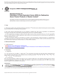 ASTM D7727-21: Standard Practice for Calculation of Dose Equivalent Xenon (DEX) for Radioactive Xenon Fission Products in Reactor Coolant provides a consistent method to calculate the dose equivalent of radioactive xenon isotopes (DEX) present in the reactor coolant of nuclear power reactors. This standard is essential for nuclear power plant operators, safety analysts, and regulatory compliance professionals to effectively monitor and manage radiological safety related to noble gas fission products released during plant operations.
