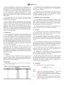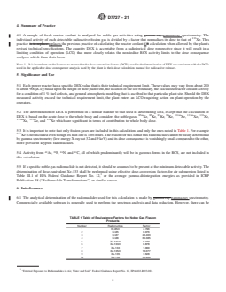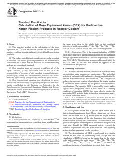 SIGNIFICANCE AND USE 5.1 Each power reactor has a specific DEX value that is their technical requirement limit. These values may vary from about 200 to about 900 μCi/g based upon the height of their plant vent, the location of the site boundary, the calculated reactor coolant activity for a condition of 1 % fuel defects, and general atmospheric modeling that is ascribed to that particular plant site. Should the DEX measured activity exceed the technical requirement limit, the plant enters an LCO requiring action on plant operation by the operators. 5.2 The determination of DEX is performed in a similar manner to that used in determining DEI, except that the calculation of DEX is based on the acute dose to the whole body and considers the noble gases 85mKr, 85Kr, 87Kr, 88Kr, 131mXe, 133mXe, 133Xe, 135mXe, 135Xe, and 138Xe which are significant in terms of contribution to whole body dose. 5.3 It is important to note that only fission gases are included in this calculation, and only the ones noted in Table 1. For example 83mKr is not included even though its half-life is 1.86 hours. The reason for this is that this radionuclide cannot be easily determined by gamma spectrometry (low energy X-rays at 32 and 9 keV) and its dose consequence is vanishingly small compared to the other, more prevalent krypton radionuclides. 5.4 Activity from 41Ar, 19F, 16N, and 11C, all of which predominantly will be in gaseous forms in the RCS, are not included in this calculation. 5.5 If a specific noble-gas radionuclide is not detected, it should be assumed to be present at the minimum-detectable activity. The determination of dose-equivalent Xe-133 shall be performed using effective dose-conversion factors for air submersion listed in Table III.1 of EPA Federal Guidance Report No. 12,3 or the average gamma-disintegration energies as provided in ICRP Publication 38 (“Radionuclide Transformations”) or similar source. SCOPE 1.1 This practice applies to the calculation of the dose equivalent to 133Xe in the reactor coolant of nuclear power reactors resulting from the radioactivity of all noble gas fission products. 1.2 The values stated in inch-pound units are to be regarded as standard. The values given in parentheses are mathematical conversions to SI units that are provided for information only and are not considered standard. 1.3 This standard does not purport to address all of the safety concerns, if any, associated with its use. It is the responsibility of the user of this standard to establish appropriate safety, health, and environmental practices and determine the applicability of regulatory limitations prior to use. 1.4 This international standard was developed in accordance with internationally recognized principles on standardization established in the Decision on Principles for the Development of International Standards, Guides and Recommendations issued by the World Trade Organization Technical Barriers to Trade (TBT) Committee.