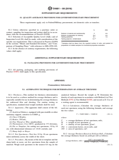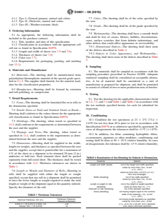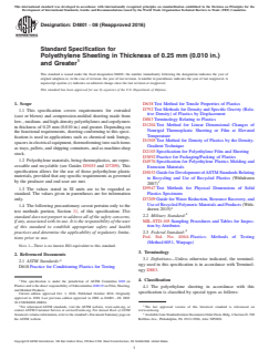 ASTM D4801-08(2016) is a technical specification published by ASTM International. Its full title is "Standard Specification for Polyethylene Sheeting in Thickness of 0.25 mm (0.010 in.) and Greater". This standard covers: ABSTRACT This specification covers the requirements for extruded (cast or blown) and compression-molded sheeting made from low-, medium-, and high-density polyethylenes and copolymers in specified thicknesses. Depending on the functional requirements, sheeting conforming to this specification is used in applications such as chemical tank linings, spacers in electrical equipment, thermoforming into such items as trays, pallets, and shipping containers, and as machine-shop stock. This specification allows for reprocessable and recyclable polyethylene plastic materials, provided that any specific requirements as governed by the producer and end user are met. The three types of polyethylene sheeting covered here are: Type I, natural or colored for general purpose; Type II, natural or colored for dielectrics; and Type III, black for weather-resistant applications. Sampled specimens shall be tested for their conformance with physical requirements as follows: dimension (length, width, diameter, and cores); form; tensile strength at yield and nominal strain at break; shrinkage; warpage and twist; and color, appearance, and workmanship. SCOPE 1.1 This specification covers requirements for extruded (cast or blown) and compression-molded sheeting made from low-, medium- and high-density polyethylenes and copolymers in thickness of 0.25 mm (0.010 in.) and greater. Depending on the functional requirements, sheeting conforming to this specification is used in applications such as chemical tank linings, spacers in electrical equipment, thermoforming into such items as trays, pallets, and shipping containers, and as machine-shop stock. 1.2 Polyethylene materials, being thermoplastics, are reprocessable and recyclable (see Guides D5033 and D7209). This specification allows for the use of those polyethylene plastic materials, provided that any specific requirements as governed by the producer and end user are met. 1.3 The values stated in SI units are to be regarded as standard. The values given in parentheses are for information only. 1.4 The following precautionary caveat pertains only to the test methods portion, Section 11, of this specification: This standard does not purport to address all of the safety concerns, if any, associated with its use. It is the responsibility of the user of this standard to establish appropriate safety and health practices and determine the applicability of regulatory limitations prior to use. Note 1: There is no known ISO equivalent to this standard.