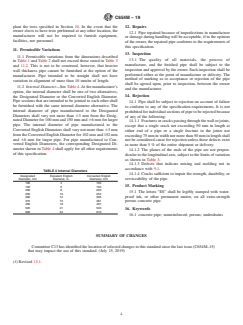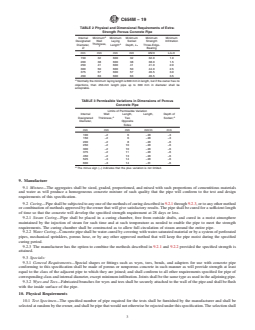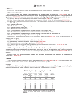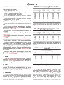 ABSTRACT This specification covers porous nonreinforced concrete pipe for use in underdrains. Pipe manufactured according to this specification shall be of two classes identified as “standard porous nonreinforced concrete pipe”, and “extra-strength porous nonreinforced concrete pipe. ” The concrete shall consist of cementitious materials, mineral, aggregates, and water. The joints shall be of such design and the ends of the concrete pipe sections so formed that the pipe can be laid together to make a continuous line pipe. The aggregates shall be sized, graded, proportioned, and mixed with such proportions of cementitious materials, and water as will produce a homogeneous concrete mixture of such quality that the pipe will conform to test and design requirements. Pipe shall be subjected to curing. Special shapes or fittings for use with concrete pipe conforming to this specification shall be made of porous or nonporous concrete in such manner as will provide strength at least equal to the class of the adjacent pipe to which they are joined; and shall conform to all other requirements specified for pipe. The test pipe shall freed from all visible moisture. When dry, each pipe shall be measured and inspected. The crushing strength of the porous material as well as its infiltration, shall conform to the requirements. SCOPE 1.1 This specification covers porous nonreinforced concrete pipe for use in underdrains. 1.2 This specification is the metric counterpart of Specification C654. 1.3 This international standard was developed in accordance with internationally recognized principles on standardization established in the Decision on Principles for the Development of International Standards, Guides and Recommendations issued by the World Trade Organization Technical Barriers to Trade (TBT) Committee.