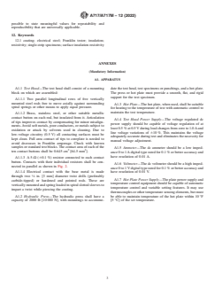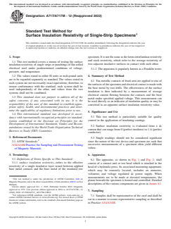 SIGNIFICANCE AND USE 5.1 This test method is particularly suitable for quality control in the application of insulating coatings. 5.2 Surface insulation resistivity is evaluated from a dc current that can range from 0 (perfect insulator) to 1 A (perfect conductor). 5.3 Single readings should not be considered significant since the nature of the test device and specimen are such that successive measurements of a specimen often yield different values. SCOPE 1.1 This test method covers a means of testing the surface insulation resistivity of single strips or punchings of flat-rolled electrical steel under predetermined conditions of voltage, pressure, and temperature. 1.2 The values stated in either SI units or inch-pound units are to be regarded separately as standard. The values stated in each system are not necessarily exact equivalents; therefore, to ensure conformance with the standard, each system shall be used independently of the other, and values from the two systems shall not be combined. 1.3 This standard does not purport to address all of the safety concerns, if any, associated with its use. It is the responsibility of the user of this standard to establish appropriate safety, health, and environmental practices and determine the applicability of regulatory limitations prior to use. 1.4 This international standard was developed in accordance with internationally recognized principles on standardization established in the Decision on Principles for the Development of International Standards, Guides and Recommendations issued by the World Trade Organization Technical Barriers to Trade (TBT) Committee.