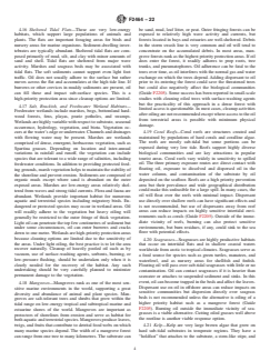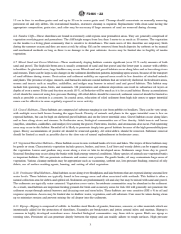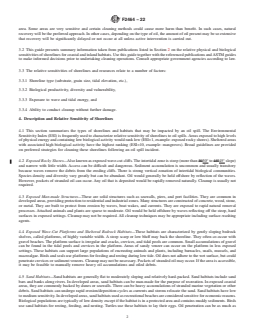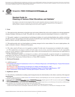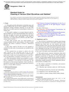 SIGNIFICANCE AND USE 3.1 One of the key considerations in making sound cleanup decisions for oiled shorelines is the relative sensitivity of the impacted area. Some areas are very sensitive and certain cleaning methods could cause more harm than benefit. In such cases, natural recovery will be the preferred approach. In other cases, depending on the type of oil, the amount of oil present may be so extensive that recovery will be significantly delayed or not occur at all unless active intervention is carried out. 3.2 This guide presents summary information taken from publications listed in Section 2 on the relative physical and biological sensitivities of shorelines for coastal and inland habitats. Use this guide together with the referenced publications and ASTM guides to make informed decisions prior to undertaking cleaning operations. Consult appropriate government agencies according to law. 3.3 The relative sensitivities of shorelines and resources relate to a number of factors: 3.3.1 Shoreline type (substrate, grain size, tidal elevation, etc.), 3.3.2 Biological productivity, diversity and vulnerability, 3.3.3 Exposure to wave and tidal energy, and 3.3.4 Ability to conduct cleanup without further damage. SCOPE 1.1 This guide provides information on shoreline types and sensitive habitats that can be used as guidance for selecting appropriate cleaning techniques following an oil spill. This guide does not address protected archaeological, historical, or cultural sites. 1.2 This guide’s emphasis is on typical physical and biological attributes of coastal and inland habitats that could be at risk from oil spills. It reviews and encompasses the entire spectrum of shoreline types representing a wide range of sensitivities. It is largely based on NOAA’s and API’s publications listed in Section 2. 1.3 This guide provides only very broad guidance on cleaning strategies for the various habitats. For more in-depth guidance, the reader is referred to Section 2, Referenced Documents. 1.4 The values stated in SI units are to be regarded as standard. No other units of measurement are included in this standard. 1.5 This standard does not purport to address all of the safety concerns, if any, associated with its use. It is the responsibility of the user of this standard to establish appropriate safety, health, and environmental practices and determine the applicability of regulatory limitations prior to use. 1.6 This international standard was developed in accordance with internationally recognized principles on standardization established in the Decision on Principles for the Development of International Standards, Guides and Recommendations issued by the World Trade Organization Technical Barriers to Trade (TBT) Committee.