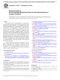 ASTM E1819-15(2021) is a guide published by ASTM International. Its full title is "Standard Guide for Environmental Monitoring Plans for Decommissioning of Nuclear Facilities". This standard covers: SIGNIFICANCE AND USE 5.1 Use of this guide will ensure that the potential impact on the surrounding environment from planned decommissioning activities has been properly assessed. 5.2 Use of this guide will ensure that the adequacy of environmental sampling has been assessed for location, frequency, analytical techniques, and media type to monitor the environment and to detect site-related releases and their impact. SCOPE 1.1 This guide covers the development or assessment of environmental monitoring plans for decommissioning nuclear facilities. This guide addresses: (1) development of an environmental baseline prior to commencement of decommissioning activities; (2) determination of release paths from site activities and their associated exposure pathways in the environment; and (3) selection of appropriate sampling locations and media to ensure that all exposure pathways in the environment are monitored appropriately. This guide also addresses the interfaces between the environmental monitoring plan and other planning documents for site decommissioning, such as radiation protection, site characterization, and waste management plans, and federal, state, and local environmental protection laws and guidance. This guide is applicable up to the point of completing D&D activities and the reuse of the facility or area for other purposes. 1.2 This international standard was developed in accordance with internationally recognized principles on standardization established in the Decision on Principles for the Development of International Standards, Guides and Recommendations issued by the World Trade Organization Technical Barriers to Trade (TBT) Committee.