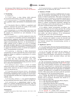SIGNIFICANCE AND USE 5.1 Use of this guide will ensure that the potential impact on the surrounding environment from planned decommissioning activities has been properly assessed. 5.2 Use of this guide will ensure that the adequacy of environmental sampling has been assessed for location, frequency, analytical techniques, and media type to monitor the environment and to detect site-related releases and their impact. SCOPE 1.1 This guide covers the development or assessment of environmental monitoring plans for decommissioning nuclear facilities. This guide addresses: (1) development of an environmental baseline prior to commencement of decommissioning activities; (2) determination of release paths from site activities and their associated exposure pathways in the environment; and (3) selection of appropriate sampling locations and media to ensure that all exposure pathways in the environment are monitored appropriately. This guide also addresses the interfaces between the environmental monitoring plan and other planning documents for site decommissioning, such as radiation protection, site characterization, and waste management plans, and federal, state, and local environmental protection laws and guidance. This guide is applicable up to the point of completing D&D activities and the reuse of the facility or area for other purposes. 1.2 This international standard was developed in accordance with internationally recognized principles on standardization established in the Decision on Principles for the Development of International Standards, Guides and Recommendations issued by the World Trade Organization Technical Barriers to Trade (TBT) Committee.