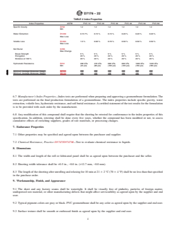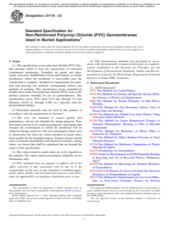 ASTM D7176-22 is a technical specification published by ASTM International. Its full title is "Standard Specification for Non-Reinforced Polyvinyl Chloride (PVC) Geomembranes Used in Buried Applications". This standard covers: SCOPE 1.1 This specification covers polyvinyl chloride (PVC) flexible sheeting which is used for construction of concealed containment membranes. Examples are ponds and lakes, canals, reservoirs, landfill liners, covers and closures, or similar installations where the membrane is inaccessible once the construction is complete. Included are requirements for materials and sheeting, test methods, workmanship criteria, and methods of marking. This specification covers unreinforced flexible sheet made from polyvinyl chloride (PVC) resin as the primary polymer intended for use in geomembranes. This specification covers PVC sheet 0.25 mm through 1.5 mm thickness (0.010 in. through 0.060 in.), typically used for geomembrane linings. 1.2 Reworked materials may be used in this product in accordance with the requirements in Section 5. 1.3 The tests are intended to ensure quality and performance, and are not intended for design purposes. Tests have been selected to be conducted primarily with liquids that simulate the environment to which the membrane will be subjected during actual use. The test and property limits used to characterize the sheet are values intended to ensure minimum quality for the intended purpose. In-place design criteria such as material compatibility and chemical resistance, among others, are factors that shall be considered but are beyond the scope of this specification. 1.4 The values stated in metric units are to be regarded as the standard. The values stated in parentheses (English) are for information only. 1.5 This standard does not purport to address all of the safety concerns, if any, associated with its use. It is the responsibility of the user of this standard to establish appropriate safety, health, and environmental practices and determine the applicability of regulatory limitations prior to use. 1.6 This international standard was developed in accordance with internationally recognized principles on standardization established in the Decision on Principles for the Development of International Standards, Guides and Recommendations issued by the World Trade Organization Technical Barriers to Trade (TBT) Committee.