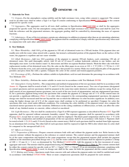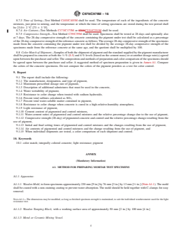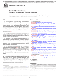 ABSTRACT This specification covers the basic requirement for colored and white pigments in powder form to be used as admixtures in concrete for the purpose of producing integrally colored concrete. Where the pigments are a constituent of a multicomponent admixture, this specification applies to the pigment constituent of the admixture. This specification does not include the determination of pigment stability when elevated temperature using low-pressure (atmospheric) or high-pressure (autoclave) steam is used to accelerate the curing process. Cement (either Type I or Type II), aggregates, and admixtures materials shall be subjected to the following test methods: water wettability; alkali resistance; percentage of sulfates; water solubility; atmospheric curing stability; light resistance; effects on concrete, which include preparation of mixtures, making and curing, time of setting, air content, and compressive strength; and color match of shipment. SCOPE 1.1 This specification covers the basic requirement for colored and white pigments in powder form to be used as admixtures in concrete for the purpose of producing integrally colored concrete. Where the pigments are a constituent of a multicomponent admixture, this specification applies to the pigment constituent of the admixture. This specification is not intended to establish compatibility of pigments with any other concrete admixtures unless they are tested in combination in accordance with 4.7. 1.2 This specification does not include the determination of pigment stability when elevated temperature using low-pressure (atmospheric) or high-pressure (autoclave) steam is used to accelerate the curing process. 1.3 In addition to tests defining the pigments themselves, a limited number of tests on concrete are included to define the effects on setting times, air content, and compressive strength. If more extensive information is required for a particular job, additional testing criteria and procedures should be agreed upon between the seller and user. 1.4 The maximum prescribed dosage rate of a pigment, established in accordance with 4.7, shall be equal to or less than 10 mass % of cement. When a combination of pigments is used to produce the desired color and color intensity, the total dosage rate of all pigments combined shall not exceed any of the individual maximum dosage rates of the component pigments. 1.5 The values stated in either SI units or inch-pound units are to be regarded separately as standard. The values stated in each system may not be exact equivalents; therefore, each system shall be used independently of the other. Combining values from the two systems may result in non-conformance with the standard. Some values have only SI units because inch-pound equivalents are not used in practice.