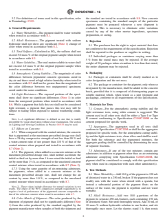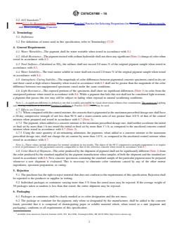 - Quality and Purity Requirements: Addresses water wettability, alkali resistance, limits for total sulfates, and water solubility to ensure pigment quality suitable for use in concrete.