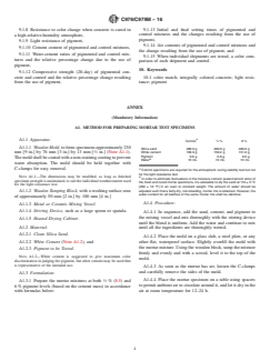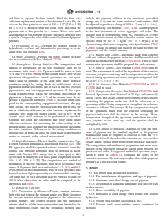ASTM C979/C979M-16 is a technical specification published by ASTM International. Its full title is "Standard Specification for Pigments for Integrally Colored Concrete". This standard covers: ABSTRACT This specification covers the basic requirement for colored and white pigments in powder form to be used as admixtures in concrete for the purpose of producing integrally colored concrete. Where the pigments are a constituent of a multicomponent admixture, this specification applies to the pigment constituent of the admixture. This specification does not include the determination of pigment stability when elevated temperature using low-pressure (atmospheric) or high-pressure (autoclave) steam is used to accelerate the curing process. Cement (either Type I or Type II), aggregates, and admixtures materials shall be subjected to the following test methods: water wettability; alkali resistance; percentage of sulfates; water solubility; atmospheric curing stability; light resistance; effects on concrete, which include preparation of mixtures, making and curing, time of setting, air content, and compressive strength; and color match of shipment. SCOPE 1.1 This specification covers the basic requirement for colored and white pigments in powder form to be used as admixtures in concrete for the purpose of producing integrally colored concrete. Where the pigments are a constituent of a multicomponent admixture, this specification applies to the pigment constituent of the admixture. This specification is not intended to establish compatibility of pigments with any other concrete admixtures unless they are tested in combination in accordance with 4.7. 1.2 This specification does not include the determination of pigment stability when elevated temperature using low-pressure (atmospheric) or high-pressure (autoclave) steam is used to accelerate the curing process. 1.3 In addition to tests defining the pigments themselves, a limited number of tests on concrete are included to define the effects on setting times, air content, and compressive strength. If more extensive information is required for a particular job, additional testing criteria and procedures should be agreed upon between the seller and user. 1.4 The maximum prescribed dosage rate of a pigment, established in accordance with 4.7, shall be equal to or less than 10 mass % of cement. When a combination of pigments is used to produce the desired color and color intensity, the total dosage rate of all pigments combined shall not exceed any of the individual maximum dosage rates of the component pigments. 1.5 The values stated in either SI units or inch-pound units are to be regarded separately as standard. The values stated in each system may not be exact equivalents; therefore, each system shall be used independently of the other. Combining values from the two systems may result in non-conformance with the standard. Some values have only SI units because inch-pound equivalents are not used in practice.
