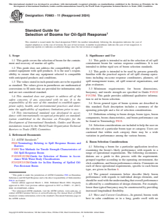 ASTM F2683-11(2024) is a guide published by ASTM International. Its full title is "Standard Guide for Selection of Booms for Oil-Spill Response". This standard covers: SIGNIFICANCE AND USE 3.1 This guide is intended to aid in the selection of oil spill containment boom for various response conditions. It is not intended to define rigid sets of boom selection standards. 3.2 This guide is intended to be used by persons generally familiar with the practical aspects of oil spill cleanup operations including on-scene response coordinators, planners, oil spill management teams, oil spill removal organizations, and plan evaluators. 3.3 Minimum requirements for boom dimensions, buoyancy, and tensile strength are specified in Guide F1523/F1523M. This guide provides additional qualitative information to aid in boom selection. 3.4 Seven general types of boom systems are described in this standard. Each description includes a summary of the operating principle and a list of selection considerations. 3.5 Definitions relating to boom design, boom types, boom components, boom characteristics, and boom performance can be found in Terminology F818. 3.6 Selection considerations are included to help the user on the selection of a particular boom type or category. Users are cautioned that within each category there may be a wide variation in performance among the various booms. SCOPE 1.1 This guide covers the selection of boom for the containment and recovery of marine oil spills. 1.2 This guide does not address the compatibility of spill-control equipment with spill products. It is the user’s responsibility to ensure that any equipment selected is compatible with anticipated products and conditions. 1.3 The values stated in inch-pound units are to be regarded as standard. The values given in parentheses are mathematical conversions to SI units that are provided for information only and are not considered standard. 1.4 This standard does not purport to address all of the safety concerns, if any, associated with its use. It is the responsibility of the user of this standard to establish appropriate safety, health, and environmental practices and determine the applicability of regulatory limitations prior to use. 1.5 This international standard was developed in accordance with internationally recognized principles on standardization established in the Decision on Principles for the Development of International Standards, Guides and Recommendations issued by the World Trade Organization Technical Barriers to Trade (TBT) Committee.