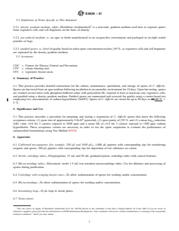 ASTM E2839-21 is a standard published by ASTM International. Its full title is "Standard Practice for Production and Storage of Spores of <emph type="bdit">C. difficile</emph > for Use in Efficacy Evaluation of Antimicrobial Agents". This standard covers: SIGNIFICANCE AND USE 5.1 This practice describes a procedure for preparing and storing a suspension of C. difficile spores that meets the following acceptance criteria: (1) spore titer of approximately 5.0×108 spores/mL, (2) spore purity of ≥95 %, and (3) a mean log10 reduction (LR) value >5.0 for 3 carriers exposed to 5000 ppm and a mean LR of E3218. SCOPE 1.1 This practice specifies the procedures for producing and storing standardized suspensions of Clostridioides difficile spores for the evaluation of the sporicidal activity of antimicrobial formulations using the Quantitative Method for Testing Antimicrobial Agents against Spores of C. difficile on Hard, Non-porous Surfaces or other procedures. 1.2 This practice may involve hazardous materials, chemicals, and microorganisms and should be performed only by persons with formal training in microbiology. 1.3 The values stated in SI units are to be regarded as standard. No other units of measurement are included in this standard. 1.4 This standard does not purport to address all of the safety concerns, if any, associated with its use. It is the responsibility of the user of this standard to establish appropriate safety, health, and environmental practices and determine the applicability of regulatory limitations prior to use. 1.5 This international standard was developed in accordance with internationally recognized principles on standardization established in the Decision on Principles for the Development of International Standards, Guides and Recommendations issued by the World Trade Organization Technical Barriers to Trade (TBT) Committee.