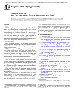 SIGNIFICANCE AND USE 4.1 This guide is relevant to the design of specialized support equipment and tools that are remotely operated, maintained, or viewed through shielding windows, or combinations thereof, or by other remote viewing systems. 4.2 Hot cells contain substances and processes that may be extremely hazardous to personnel or the external environment, or both. Process safety and reliability are improved with successful design, installation, and operation of specialized mechanical and support equipment. 4.3 Use of this guide in the design of specialized mechanical and support equipment can reduce costs, improve productivity, reduce failed hardware replacement time, and provide a standardized design approach. SCOPE 1.1 Intent: 1.1.1 This guide presents practices and guidelines for the design and implementation of equipment and tools to assist assembly, disassembly, alignment, fastening, maintenance, or general handling of equipment in a hot cell. Operating in a remote hot cell environment significantly increases the difficulty and time required to perform a task compared to completing a similar task directly by hand. Successful specialized support equipment and tools minimize the required effort, reduce risks, and increase operating efficiencies. 1.2 Applicability: 1.2.1 This guide may apply to the design of specialized support equipment and tools anywhere it is remotely operated, maintained, and viewed through shielding windows or by other remote viewing systems. 1.2.2 Consideration should be given to the need for specialized support equipment and tools early in the design process. 1.2.3 The values stated in inch-pound units are to be regarded as standard. The values given in parentheses are mathematical conversions to SI units that are provided for information only and are not considered standard. 1.3 Caveats: 1.3.1 This guide is generic in nature and addresses a wide range of remote working configurations. Other acceptable and proven international configurations exist and provide options for engineer and designer consideration. Specific designs are not a substitute for applied engineering skills, proven practices, or experience gained in any specific situation. 1.3.2 This guide does not supersede federal or state regulations, or both, or codes applicable to equipment under any conditions. 1.3.3 This standard does not purport to address all of the safety concerns, if any, associated with its use. It is the responsibility of the user of this standard to establish appropriate safety, health, and environmental practices and determine the applicability of regulatory limitations prior to use. 1.4 This international standard was developed in accordance with internationally recognized principles on standardization established in the Decision on Principles for the Development of International Standards, Guides and Recommendations issued by the World Trade Organization Technical Barriers to Trade (TBT) Committee.