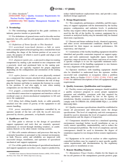 ASTM C1725-17(2022) is a guide published by ASTM International. Its full title is "Standard Guide for Hot Cell Specialized Support Equipment and Tools". This standard covers: SIGNIFICANCE AND USE 4.1 This guide is relevant to the design of specialized support equipment and tools that are remotely operated, maintained, or viewed through shielding windows, or combinations thereof, or by other remote viewing systems. 4.2 Hot cells contain substances and processes that may be extremely hazardous to personnel or the external environment, or both. Process safety and reliability are improved with successful design, installation, and operation of specialized mechanical and support equipment. 4.3 Use of this guide in the design of specialized mechanical and support equipment can reduce costs, improve productivity, reduce failed hardware replacement time, and provide a standardized design approach. SCOPE 1.1 Intent: 1.1.1 This guide presents practices and guidelines for the design and implementation of equipment and tools to assist assembly, disassembly, alignment, fastening, maintenance, or general handling of equipment in a hot cell. Operating in a remote hot cell environment significantly increases the difficulty and time required to perform a task compared to completing a similar task directly by hand. Successful specialized support equipment and tools minimize the required effort, reduce risks, and increase operating efficiencies. 1.2 Applicability: 1.2.1 This guide may apply to the design of specialized support equipment and tools anywhere it is remotely operated, maintained, and viewed through shielding windows or by other remote viewing systems. 1.2.2 Consideration should be given to the need for specialized support equipment and tools early in the design process. 1.2.3 The values stated in inch-pound units are to be regarded as standard. The values given in parentheses are mathematical conversions to SI units that are provided for information only and are not considered standard. 1.3 Caveats: 1.3.1 This guide is generic in nature and addresses a wide range of remote working configurations. Other acceptable and proven international configurations exist and provide options for engineer and designer consideration. Specific designs are not a substitute for applied engineering skills, proven practices, or experience gained in any specific situation. 1.3.2 This guide does not supersede federal or state regulations, or both, or codes applicable to equipment under any conditions. 1.3.3 This standard does not purport to address all of the safety concerns, if any, associated with its use. It is the responsibility of the user of this standard to establish appropriate safety, health, and environmental practices and determine the applicability of regulatory limitations prior to use. 1.4 This international standard was developed in accordance with internationally recognized principles on standardization established in the Decision on Principles for the Development of International Standards, Guides and Recommendations issued by the World Trade Organization Technical Barriers to Trade (TBT) Committee.