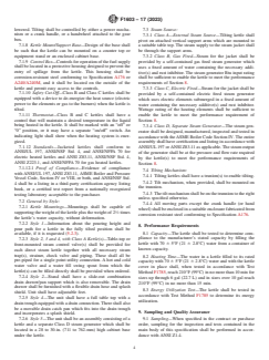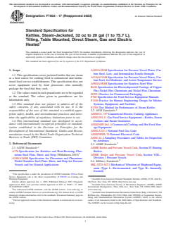 ASTM F1603-17(2023) is a technical specification published by ASTM International. Its full title is "Standard Specification for Kettles, Steam-Jacketed, 32 oz to 20 gal (1 to 75.7 L), Tilting, Table Mounted, Direct Steam, Gas and Electric Heated". This standard covers: ABSTRACT This specification covers jacketed kettles using steam as a source of heat for cooking food in commercial and institutional food service establishments. However, it does not cover equipment used by food processors. Covered by this specification are jacketed kettles of various sizes (capacities), grades (Grades 1-3 based on maximum working pressure), styles (Styles 1-5 according to mounting configuration), and classes (Classes A-D based on steam source, whether direct steam or gas-fired or electric steam generator). Kettle and steam jacket shall be manufactured from Type 304, 304L, 316, or 316L corrosion resistant steel. All exterior surfaces of Styles 3-5 kettle stands and bases shall be made of Type 302, 304, 316, or 430 corrosion resistant steel, while those of the kettle mount or support base shall be chrome plated or made of Type 304, 316, or 430 corrosion resistant steel such as for exterior surfaces of console and base of Class B and C kettles. As specified, the kettles shall be provided with the following components: insulation casing, covers and/or operating handles, safety relief valve, swing spout water supply, basket insert, tilt mechanism (hand or crank tilt), kettle mount or support base, control box, safety cut-off, and thermostat. The kettle shall be tested for capacity, heating time, and energy utilization, and shall conform to the requirements specified. SCOPE 1.1 This specification covers jacketed kettles that use steam as a heat source for cooking food in commercial and institutional food service establishments. This specification does not cover equipment used by food processors who normally package the food that they cook. 1.2 The values stated in inch-pound units are to be regarded as the standard. The values given in parentheses are for information only. 1.3 This standard does not purport to address all of the safety concerns, if any, associated with its use. It is the responsibility of the user of this standard to establish appropriate safety, health, and environmental practices and determine the applicability of regulatory limitations prior to use. 1.4 This international standard was developed in accordance with internationally recognized principles on standardization established in the Decision on Principles for the Development of International Standards, Guides and Recommendations issued by the World Trade Organization Technical Barriers to Trade (TBT) Committee.