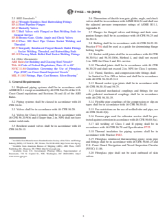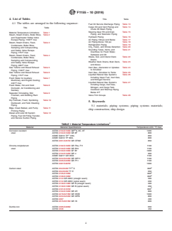 ABSTRACT This practice is intended as a guide to shipbuilders, shipowners, and design agents for use in the preparation of piping system material schedules for commercial ship design and construction. The materials and limitations listed in this specification meet the minimum requirements of the U.S. Coast Guard and the American Bureau of Shipping and should be considered to be the minimum acceptable materials in regard to material, design, and testing. SCOPE 1.1 This practice is intended as a guide to shipbuilders, shipowners, and design agents for use in the preparation of piping system material schedules for commercial ship design and construction. 1.2 The materials and limitations listed in Tables 1-28 meet the minimum requirements of the U.S. Coast Guard and the American Bureau of Shipping and, except for titanium, should be considered to be the minimum acceptable materials in regard to material, design, and testing. This document is not intended to limit the selection of material strictly to those listed. Other equal or superior materials may be used provided that they are acceptable to the regulatory bodies and classification societies. Note 1: Titanium has been added as its use in fresh and sea water systems is becoming more common. 1.3 This international standard was developed in accordance with internationally recognized principles on standardization established in the Decision on Principles for the Development of International Standards, Guides and Recommendations issued by the World Trade Organization Technical Barriers to Trade (TBT) Committee.