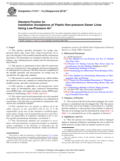 ASTM F1417-11A(2019)e1 is a standard published by ASTM International. Its full title is "Standard Practice for Installation Acceptance of Plastic Non-pressure Sewer Lines Using Low-Pressure Air". This standard covers: SIGNIFICANCE AND USE 4.1 This low-pressure air testing practice detects damaged piping or improper jointing by measuring the rate at which air under pressure escapes from an isolated section of sewer. 4.2 The rate of air loss indicates the presence or absence of damaged piping or leaking joints. This practice is not intended to show total system water leakage limits and shall not be used as a quantitative measure of leakage under service conditions for infiltration or exfiltration. Note 1: A finding of acceptable air loss specified in this practice can be interpreted as an installation acceptance test in lieu of infiltration or exfiltration testing. 4.3 This practice provides assurance of initial condition and quality of workmanship of properly-installed sewer pipe. SCOPE 1.1 This practice provides procedures for testing non-pressure plastic pipe sewer lines, using low-pressure air to prove the integrity of the installed material and the construction procedures. Two procedures are included to find the rate of air leakage—the constant-pressure method and the time-pressure drop method. 1.2 This practice is performed on lines after all connections and service laterals have been plugged and braced adequately to withstand the test pressure. The time between completion of the backfill operation and low-pressure air testing may be specified by the approving authority. 1.3 This practice is used as a preliminary test, which enables the installer to show the condition of a buried line prior to final backfill, paving, and other construction activities. 1.4 This practice is applicable to all non-pressure sewer lines made of thermoplastic pipe, reinforced thermosetting resin (RTRP) pipe, and reinforced plastic mortar (RPM) pipe, defined in Terminology D883, D1600, and F412. 1.5 The values stated in inch-pound units are to be regarded as standard. The values given in parentheses are mathematical conversions to SI units that are provided for information only and are not considered standard. 1.6 This standard does not purport to address all of the safety concerns, if any, associated with its use. It is the responsibility of the user of this standard to establish appropriate safety, health, and environmental practices and determine the applicability of regulatory limitations prior to use. For specific precautionary statements, see Section 5. 1.7 This international standard was developed in accordance with internationally recognized principles on standardization established in the Decision on Principles for the Development of International Standards, Guides and Recommendations issued by the World Trade Organization Technical Barriers to Trade (TBT) Committee.