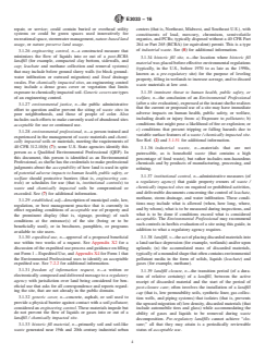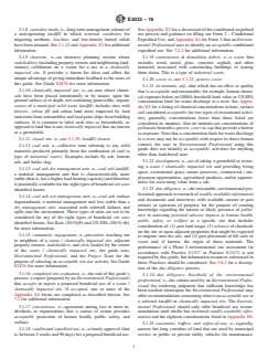 SIGNIFICANCE AND USE 4.1 Purpose—This guide provides a process (complementary to various regulatory agency waste site use programs) for evaluating and restoring among eight site use activities at eleven types of waste / chemically impacted sites. The site use activities include: (1) Active Recreation; (2) Passive Recreation; (3) Alternate Energy / Deep Anchoring Need; (4) Materials Recovery; (5) Stormwater Management; (6) Composting Imported Debris; (7) Agricultural Cultivation (non- or lightly mechanized) or Marketing; and, (8) Nature Preserve / Nature-based / Buffer Area Use. The waste / chemically impacted sites include: (1) MSW / Pre-RCRA; (2) MSW / Post-RCRA Closure – Operated pre-RCRA; (3) MSW / Operating(ed) or Closed Post-RCRA; (4) MSW / In-design; (5) C&D Landfill / Closed; (6) C&D Landfill / Operating or In-design; (7) Historic Fill; (8) Airborne Deposition; (9) Monofill / Coal Ash; (10) Monofill / Foundry Sand; (11) Non-impacted Buffer Area. More detailed descriptions of these use activities follow. 4.1.1 Active Recreation—Utilization of a waste / chemically impacted site where the likelihood of physical contact with and accidental ingestion of soil is high, due to the nature of the sport (for example, football, baseball, soccer). Note that active sports played on synthetic turf are not active recreational uses in this definition, as the focus is on potential human exposure to chemicals in soil and not on the activity, per se. See Appendix X5 for a listing of chemical compounds and their concentrations considered appropriate for this site use. Also, see 3.1.65 for additional discussion of SCOs. 4.1.2 Passive Recreation—Utilization of a waste / chemically impacted site where physical contact with and ingestion of soil is possible but unlikely (for example, biking, walking, bird watching). See Appendix X5 for a listing of chemical compounds and their concentrations considered appropriate for this site use. Also, see 3.1.65 for additional discussion of SCOs. 4.1.3 Alter... SCOPE 1.1 This guide provides a beneficial, acceptable use framework for the development of: (1) Inactive and pre-RCRA (or pre-regulatory) solid waste landfills that are considered orphan or latchkey to be repurposed, despite having offsite migration impacts of landfill gases and/or leachate, albeit at de minimis levels; (2) other types of unregulated waste landfills; (3) sites impacted by chemical releases; (4) legacy or ongoing, intentional, or unintentional fill placement; (5) closed, open, or operating post-RCRA landfills or landfills in the planning stages such that materials may be placed in ways that optimize a landfill's use in future years; and (6) underutilized or heavily used (for example, pedestrian; recreational; or repetitive, entertainment, single event) chemically impacted sites. Also, this guide identifies land usage and conditions of adjacent/non-waste portions of a landfill (that is, buffer areas not within the footprint of an actual landfill or chemically impacted site itself) that should be evaluated before a site use is considered acceptable. 1.2 Provided herein is instruction on evaluating and judging the acceptability of: (1) Chemical exposure barrier(s) (and other engineering and institutional control measures) in place between actual or potential chemically impacted soil; and/or (2) time of use restriction(s) established at a waste / chemically impacted site. 1.3 Additionally provided is instruction on assessing the terminal conditions at a municipal solid waste (MSW) landfill; that is, flows of methane below which passive rather than active venting is recommended, and flows of leachate of a long-term, consistent quality that is clean enough to allow direct discharge of the liquid to surface waters. See Appendix X3 for additional information. 1.4 This guide complements solid waste regulatory programs where guidance on beneficial usage is unavailable or insufficient, thereby improving the chan...