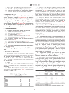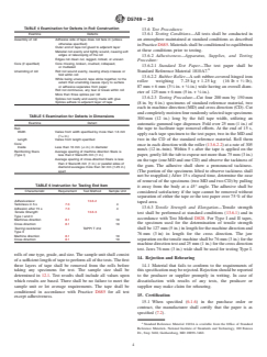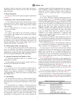 ABSTRACT This specification covers reinforced (Type I) and plain (Type II) paper gummed adhesive tapes used for securing and banding paper products and sealing fiberboard boxes. Type I gummed tape may be strippable (Class 1) or nonstrippable (Class 2), while Type II paper-backed gummed tape, whether Grade A (light duty), B (medium duty), or C (heavy duty), is nonstrippable. The tapes shall be manufactured from kraft paper, but the use of recycled pulp in the paper is encouraged as well, and the adhesive used must not have an offensive odor and shall conform to the environmental considerations specified. Type I tapes shall consist of two strips of paper in roll form, while Type II tapes shall consist of one strip of paper in roll form. Upon manufacture, the tape shall be clean and free of folds, sharp creases, tears, cuts, and holes. The tapes shall be examined for visual defects, defects in roll construction, and defects in dimensions. Tests for adhesiveness, tensile strength, and elongation shall be performed as well, and shall conform to the physical properties specified. SCOPE 1.1 This specification covers plain and reinforced paper gummed adhesive tapes suitable for securing and banding paper products and closing fiberboard boxes. 1.2 This specification is intended to replace Fed. Specs. CID A-A-1492, CID A-A-1671, and PPP-T-45 in part. 1.3 The values stated in SI units are to be regarded as standard. The values given in parentheses are for information only. 1.4 The following safety hazards caveat pertains only to the test methods portion, Section 11, of this specification: This standard does not purport to address all of the safety concerns, if any, associated with its use. It is the responsibility of the user of this standard to establish appropriate safety, health, and environmental practices and determine the applicability of regulatory limitations prior to use. 1.5 This international standard was developed in accordance with internationally recognized principles on standardization established in the Decision on Principles for the Development of International Standards, Guides and Recommendations issued by the World Trade Organization Technical Barriers to Trade (TBT) Committee.