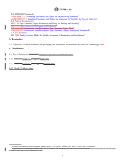 ASTM D5749-24 is a technical specification published by ASTM International. Its full title is "Standard Specification for Reinforced and Plain Gummed Tape for Sealing and Securing". This standard covers: ABSTRACT This specification covers reinforced (Type I) and plain (Type II) paper gummed adhesive tapes used for securing and banding paper products and sealing fiberboard boxes. Type I gummed tape may be strippable (Class 1) or nonstrippable (Class 2), while Type II paper-backed gummed tape, whether Grade A (light duty), B (medium duty), or C (heavy duty), is nonstrippable. The tapes shall be manufactured from kraft paper, but the use of recycled pulp in the paper is encouraged as well, and the adhesive used must not have an offensive odor and shall conform to the environmental considerations specified. Type I tapes shall consist of two strips of paper in roll form, while Type II tapes shall consist of one strip of paper in roll form. Upon manufacture, the tape shall be clean and free of folds, sharp creases, tears, cuts, and holes. The tapes shall be examined for visual defects, defects in roll construction, and defects in dimensions. Tests for adhesiveness, tensile strength, and elongation shall be performed as well, and shall conform to the physical properties specified. SCOPE 1.1 This specification covers plain and reinforced paper gummed adhesive tapes suitable for securing and banding paper products and closing fiberboard boxes. 1.2 This specification is intended to replace Fed. Specs. CID A-A-1492, CID A-A-1671, and PPP-T-45 in part. 1.3 The values stated in SI units are to be regarded as standard. The values given in parentheses are for information only. 1.4 The following safety hazards caveat pertains only to the test methods portion, Section 11, of this specification: This standard does not purport to address all of the safety concerns, if any, associated with its use. It is the responsibility of the user of this standard to establish appropriate safety, health, and environmental practices and determine the applicability of regulatory limitations prior to use. 1.5 This international standard was developed in accordance with internationally recognized principles on standardization established in the Decision on Principles for the Development of International Standards, Guides and Recommendations issued by the World Trade Organization Technical Barriers to Trade (TBT) Committee.