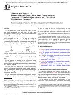 ASTM A542/A542M-19 is a technical specification published by ASTM International. Its full title is "Standard Specification for Pressure Vessel Plates, Alloy Steel, Quenched-and-Tempered, Chromium-Molybdenum, and Chromium-Molybdenum-Vanadium". This standard covers: ABSTRACT This specification covers pressure vessel plates, alloy steel, quenched-and-tempered, chromium-molybdenum, and chromium-molybdenum-vanadium. As a steel making practice, the steel shall be killed and shall conform to specified fine austenitic grain size requirements. Plate types A, B, C, D, and E shall be heat treated by heating to a suitable austenitizing temperature, holding for a sufficient period of time to attain uniform temperature throughout the thickness, and quenching in a suitable liquid medium by spraying or immersion. The steel shall conform to the required chemical compositions. The required mechanical properties that include tension test requirements and notch toughness requirements are presented in details. SCOPE 1.1 This specification2 covers two types of 21/4 Cr-1 Mo and three types of Cr-Mo-V alloy steel plates for use in the quenched-and-tempered condition, intended for the fabrication of welded pressure vessels and components. 1.2 Material under this specification is available in five types, designated “A,” “B,” “C,” “D,” and “E.” Type B is identical to Type A except for restrictive limits for carbon, phosphorus, sulfur, and nickel. The material is also available in five classes having the following strength levels. Type E is available only as Class 4 and 4a. Class Minimum Tensile Strength, ksi [MPa] 1 105 [725] 2 115 [795] 3 95 [655] 4 and 4a 85 [585] 1.3 The maximum thickness of plates is limited only by the capacity of the chemical composition to meet the specified mechanical property requirements. 1.4 The minimum thickness of plates is limited to 3/16 in. [5 mm]. 1.5 The material is intended to be suitable for fusion welding. Welding technique is of fundamental importance and it is presupposed that welding procedures will be in accordance with approved methods. 1.6 These alloy steel plates in the as-rolled condition are sensitive to cracking during flame cutting, transit, and handling. They should be shipped in the as-rolled condition only with the mutual agreement of the manufacturer and the purchaser or fabricator. 1.7 The values stated in either inch-pound units or SI units are to be regarded separately as standard. Within the text, the SI units are shown in brackets. The values stated in each system are not exact equivalents, therefore, each system must be used independently of the other. Combining values from the two systems may result in nonconformance with this specification. 1.8 This international standard was developed in accordance with internationally recognized principles on standardization established in the Decision on Principles for the Development of International Standards, Guides and Recommendations issued by the World Trade Organization Technical Barriers to Trade (TBT) Committee.