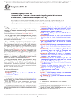 ASTM B779-22 is a technical specification published by ASTM International. Its full title is "Standard Specification for Shaped Wire Compact Concentric-Lay-Stranded Aluminum Conductors, Steel-Reinforced (ACSR/TW)". This standard covers: ABSTRACT This specification covers shaped wire compact concentric-lay-stranded aluminum conductor, steel-reinforced (ACSR/TW) and its component wires for use as overhead electrical conductors. Requirements for (1) wire stranding (2) tensile strength and elongation, (3) joints such as electric-butt welds, electric-butt cold-upset welds, or cold-pressure welds, and (4) lay length, diameter, direction, and factor are detailed. The construction requirements include: nominal aluminum cross sectional area, conductor type, nominal number of aluminum wires, number of layers, number and diameter of the steel core wire, mass per unit length, rated strength, and outside diameter of the shaped wire compact. The methods of determining mass per unit length, cross-section, and electrical resistance of the stranded conductor are given. Mechanical and electrical tests shall be performed before stranding. SCOPE 1.1 This specification covers shaped wire compact concentric-lay-stranded aluminum conductor, steel-reinforced (ACSR/TW) and its component wires for use as overhead electrical conductors (Explanatory Note 1 and Note 2). 1.2 The values stated in inch-pound units are to be regarded as standard. The values given in parentheses are mathematical conversions to SI units that are provided for information only and are not considered standard. Note 1: ACSR/TW is designed to increase the aluminum area for a given diameter of conductor by the use of trapezoidally shaped wires (TW). The conductors consist of a central core of round steel wire(s) surrounded by two or more layers of trapezoidal aluminum 1350-H19 wires. Different strandings of the same size of conductor are identified by type, which is the approximate ratio of steel area to aluminum area expressed in percent (Table 1, Table 2 and Table 3). For the purpose of this specification, the sizes listed in Table 1 and Table 2 are tabulated on the basis of the finished conductor having an area or outside diameter equal to that of specific sizes of standard ACSR so as to facilitate conductor selection. Note 2: The aluminum and temper designations conform to ANSI Standard H 35.1. Aluminum 1350 corresponds to Unified Numbering System (UNS) A91350 in accordance with Practice E527. 1.3 This international standard was developed in accordance with internationally recognized principles on standardization established in the Decision on Principles for the Development of International Standards, Guides and Recommendations issued by the World Trade Organization Technical Barriers to Trade (TBT) Committee.