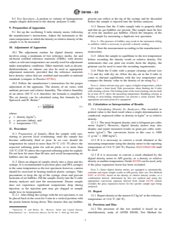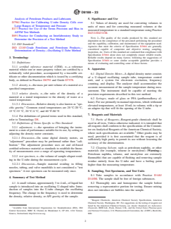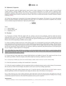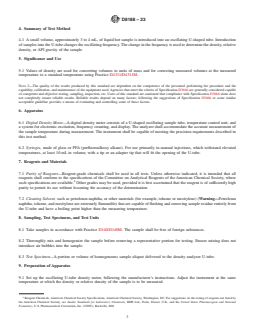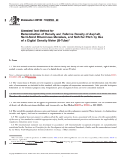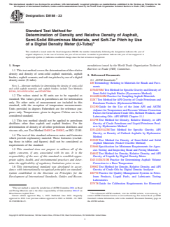 SIGNIFICANCE AND USE 5.1 Values of density are used for converting volumes to units of mass and for correcting measured volumes at the measured temperature to a standard temperature using Practice D4311/D4311M. Note 2: The quality of the results produced by this standard are dependent on the competence of the personnel performing the procedure and the capability, calibration, and maintenance of the equipment used. Agencies that meet the criteria of Specification D3666 are generally considered capable of competent and objective testing, sampling, inspection, etc. Users of this standard are cautioned that compliance with Specification D3666 alone does not completely ensure reliable results. Reliable results depend on many factors; following the suggestions of Specification D3666 or some similar acceptable guideline provides a means of evaluating and controlling some of those factors. SCOPE 1.1 This test method covers the determination of the relative density and density of semi-solid asphalt materials, asphalt binders, asphalt cements, and soft-tar pitches by use of a digital density meter (U-tube). Note 1: Alternate methods for determining the density of semi-solid and solid asphalt materials and asphalt binders include Test Methods D3289, D3142/D3142M, and D70/D70M. 1.2 The values stated in SI units are to be regarded as standard. The values given in parentheses are for information only. No other units of measurement are included in this standard, with the exception of temperature measurements. Units provided in degrees Fahrenheit are for reference purposes only. Temperatures given in degrees Celsius are to be considered standard. 1.3 This test method should not be applied to petroleum distillates other than asphalt and asphalt binders. For the determination of density of all other petroleum distillates and viscous oils, use Test Method D4052 or D5002, or ISO 12185. 1.4 The text of this standard references notes and footnotes which provide explanatory material. These footnotes (excluding those in tables and figures) shall not be considered as requirements of the standard. 1.5 This standard does not purport to address all of the safety concerns, if any, associated with its use. It is the responsibility of the user of this standard to establish appropriate safety, health, and environmental practices and determine the applicability of regulatory limitations prior to use. 1.6 This international standard was developed in accordance with internationally recognized principles on standardization established in the Decision on Principles for the Development of International Standards, Guides and Recommendations issued by the World Trade Organization Technical Barriers to Trade (TBT) Committee.