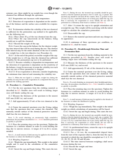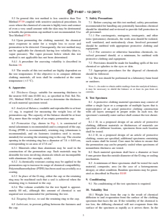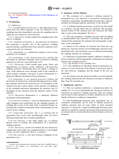 SIGNIFICANCE AND USE 5.1 This test method establishes a standard procedure for rapidly (in 1 h or less) determining the chemical resistance of specimens of protective clothing materials. This test method can be used to rank materials as to their suitability for use with liquids of known or unknown composition. 5.2 The breakthrough detection time, permeation rate, or cumulative permeation can be used to identify protective clothing materials that are more likely to limit potential exposures to chemicals. Longer breakthrough detection times and lower cumulative amounts permeated and permeation rates are characteristics of materials that are better barriers to the test chemical. 5.3 In general this test method is less sensitive than Test Method F739 coupled with sensitive analytical procedures. In cases where the chemical of concern is highly toxic and contact of even a very small amount with the skin may be detrimental to health, the permeation cup method is not recommended. Use Test Method F739. 5.4 Upon permeating the clothing material, the chemical must evaporate in order for a weight loss to occur and permeation to be detected. Consequently, the test method may not be applicable for chemicals having low volatility (that is, vapor pressure). The vapor pressure below which this test method is not applicable has not been determined. 5.4.1 A procedure for assessing volatility is described in Section 10. 5.5 The results of this test method are highly dependent on the test temperature. If the objective is to compare different clothing materials, all tests shall be conducted at the same temperature (±3 °C). SCOPE 1.1 This test method measures the barrier effectiveness of a specimen of protective clothing upon continuous contact with a liquid. 1.1.1 Procedure A—For use when a value for the cumulative amount of chemical permeated in 1 h is desired. 1.1.2 Procedure B—For use when breakthrough detection time and permeation rate values are desired. 1.2 Although not addressed herein, the effect of the test chemical on the clothing material can be determined by comparing the weight or other physical properties of the specimen before and after the permeation test. 1.3 The values stated in SI units are to be regarded as standard. The values given in parentheses are mathematical conversions to inch-pound units that are provided for information only and are not considered standard. 1.4 This standard does not purport to address all of the safety concerns, if any, associated with its use. It is the responsibility of the user of this standard to establish appropriate safety and health practices and determine the applicability of regulatory limitations prior to use. Specific precautionary statements are given in Section 7. 1.5 This international standard was developed in accordance with internationally recognized principles on standardization established in the Decision on Principles for the Development of International Standards, Guides and Recommendations issued by the World Trade Organization Technical Barriers to Trade (TBT) Committee.