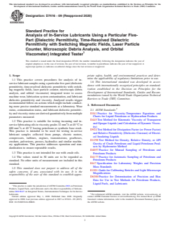 ASTM D7416-09(2020) is an international standard established by ASTM International that defines a systematic practice for the analysis of as-received and in-service lubricants using a particular five-part integrated tester. This comprehensive practice utilizes multiple technologies-dielectric permittivity, time-resolved dielectric permittivity with switching magnetic fields, laser particle counting, microscopic debris analysis, and orbital viscometry-to assess lubricant health and machinery wear in industrial settings. The standard aims to empower plant maintenance personnel to perform reliable, on-site oil analysis to detect common lubrication problems, machinery contamination, and early signs of mechanical failure.