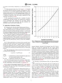SIGNIFICANCE AND USE 4.1 Although Co-60 nuclei only emit monoenergetic gamma rays at 1.17 and 1.33 MeV, the finite thickness of sources, and encapsulation materials and other surrounding structures that are inevitably present in irradiators can contribute a substantial amount of low-energy gamma radiation, principally by Compton scattering (1, 2).3 In radiation-hardness testing of electronic devices this low-energy photon component of the gamma spectrum can introduce significant dosimetry errors for a device under test since the equilibrium absorbed dose as measured by a dosimeter can be quite different from the absorbed dose deposited in the device under test because of absorbed dose enhancement effects (3, 4). Absorbed dose enhancement effects refer to the deviations from equilibrium absorbed dose caused by non-equilibrium electron transport near boundaries between dissimilar materials. 4.2 The ionization chamber technique described in this method provides an easy means for estimating the importance of the low-energy photon component of any given irradiator type and configuration. 4.3 When there is an appreciable low-energy spectral component present in a particular irradiator configuration, special experimental techniques should be used to ensure that dosimetry measurements adequately represent the absorbed dose in the device under test. (See Practice E1249.) SCOPE 1.1 Low energy components in the photon energy spectrum of Co-60 irradiators lead to absorbed dose enhancement effects in the radiation-hardness testing of silicon electronic devices. These low energy components may lead to errors in determining the absorbed dose in a specific device under test. This method covers procedures for the use of a specialized ionization chamber to determine a figure of merit for the relative importance of such effects. It also gives the design and instructions for assembling this chamber. 1.2 This method is applicable to measurements in Co-60 radiation fields where the range of exposure rates is 7 × 10 −6 to 3 × 10−2 C kg −1 s−1 (approximately 100 R/h to 100 R/s). For guidance in applying this method to radiation fields where the exposure rate is >100 R/s, see Appendix X1. Note 1: See Terminology E170 for definition of exposure and its units. 1.3 The values stated in SI units are to be regarded as the standard. The values given in parentheses are for information only. 1.4 This standard does not purport to address all of the safety concerns, if any, associated with its use. It is the responsibility of the user of this standard to establish appropriate safety, health, and environmental practices and determine the applicability of regulatory limitations prior to use. 1.5 This international standard was developed in accordance with internationally recognized principles on standardization established in the Decision on Principles for the Development of International Standards, Guides and Recommendations issued by the World Trade Organization Technical Barriers to Trade (TBT) Committee.