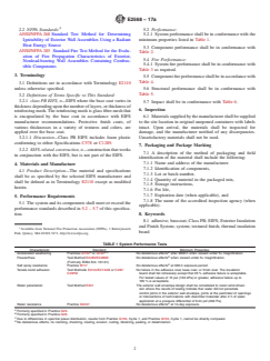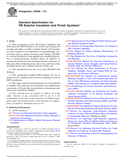 ASTM E2568-17a is a technical specification published by ASTM International. Its full title is "Standard Specification for PB Exterior Insulation and Finish Systems". This standard covers: ABSTRACT This specification covers PB Exterior Insulation and Finish Systems (EIFS) defined as an exterior, non-bearing wall covering providing a weather-resistant exterior wall envelope on walls required to be combustible or noncombustible, fireresistance-rated or nonfire-resistance-rated. Further, PB EIFS is a system described as being applied over insulation board, an adhesive or mechanical attachment of the insulation board to a substrate, or both, glass fiber reinforcing mesh, a base coat on the face of the insulation board, and a textured protective finish coat. The following tests shall be performed in accordance to the following test methods” accelerated weathering; freeze/thaw; salt spray resistance; tensile bond adhesion; water penetration; water resistance; physical properties and requirements for EPS; alkali resistance of reinforcing mesh; fire endurance; full-scale multi-story fire test; and ignition resistance. SCOPE 1.1 This specification covers PB Exterior Insulation and Finish Systems (EIFS) defined as an exterior, non-bearing wall covering providing a weather-resistant exterior wall envelope on walls required to be combustible or noncombustible, fire-resistance-rated or nonfire-resistance-rated. Further, PB EIFS is a system described as being applied over expanded polystyrene or polyisocyanurate insulation board, an adhesive or mechanical attachment of the insulation board to a substrate, or both, glass fiber reinforcing mesh, a base coat on the face of the insulation board, and a textured protective finish coat. 1.2 This specification does not cover Class PB EIFS with drainage. 1.3 This specification qualifies EIFS products for use in normal service conditions and is not for evaluating in service EIFS installations. 1.4 The values stated in inch-pound units are to be regarded as standard. The values given in parentheses are mathematical conversions to SI units that are provided for information only and are not considered standard. 1.5 This standard does not purport to address all of the safety concerns, if any, associated with its use. It is the responsibility of the user of this standard to establish appropriate safety and health practices and determine the applicability of regulatory limitations prior to use.