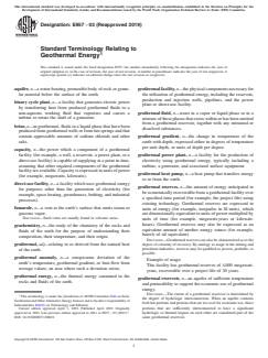 ASTM E957-03(2019): Standard Terminology Relating to Geothermal Energy is an essential international standard published by ASTM. It provides a comprehensive set of definitions and terminology widely used in the geothermal energy industry. Developed under internationally recognized procedures, this terminology standard helps unify communication, supports technical documentation, and facilitates regulatory and commercial activities related to geothermal resources. By standardizing key terms, ASTM E957 ensures clarity, consistency, and alignment across industry stakeholders, government agencies, engineers, and researchers.