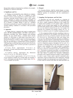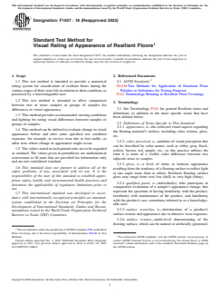 ASTM F1037-18(2022) is a standard published by ASTM International. Its full title is "Standard Test Method for Visual Rating of Appearance of Resilient Floors". This standard covers: SIGNIFICANCE AND USE 4.1 Ratings are developed by some subjective or comparative evaluation criteria, or both, of a sample(s) to some reference criteria or when compared to a control sample. These parameters generally include change in gloss, color, surface texture, alterations to pattern and possibly restorability of appearance with normal maintenance procedures, including the use of finishes or buffing. Rating is done by a qualified individual or preferably by a panel of qualified observers under specified lighting conditions in accordance with prescribed procedures. SCOPE 1.1 This test method is intended to provide a numerical rating system for classification of resilient floors during the various stages of their wear life in relation to their condition, as perceived by a knowledgeable user. 1.2 This test method is intended to allow comparison between two or more samples or groups of samples for differences in visual appearance. 1.3 This method provides recommended viewing conditions and lighting for rating visual differences between samples or groups of samples. 1.4 This method can be utilized to evaluate change in visual appearance before and after some specified test condition exposure, for example, in service wear due to foot traffic, or other tests where change in appearance might occur. 1.5 The values stated in inch-pound units are to be regarded as standard. The values given in parentheses are mathematical conversions to SI units that are provided for information only and are not considered standard. 1.6 This standard does not purport to address all of the safety problems, if any, associated with its use. It is the responsibility of the user of this standard to establish appropriate safety, health, and environmental health practices and determine the applicability of regulatory limitations prior to use. 1.7 This international standard was developed in accordance with internationally recognized principles on standardization established in the Decision on Principles for the Development of International Standards, Guides and Recommendations issued by the World Trade Organization Technical Barriers to Trade (TBT) Committee.