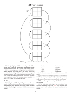 SIGNIFICANCE AND USE 4.1 Ratings are developed by some subjective or comparative evaluation criteria, or both, of a sample(s) to some reference criteria or when compared to a control sample. These parameters generally include change in gloss, color, surface texture, alterations to pattern and possibly restorability of appearance with normal maintenance procedures, including the use of finishes or buffing. Rating is done by a qualified individual or preferably by a panel of qualified observers under specified lighting conditions in accordance with prescribed procedures. SCOPE 1.1 This test method is intended to provide a numerical rating system for classification of resilient floors during the various stages of their wear life in relation to their condition, as perceived by a knowledgeable user. 1.2 This test method is intended to allow comparison between two or more samples or groups of samples for differences in visual appearance. 1.3 This method provides recommended viewing conditions and lighting for rating visual differences between samples or groups of samples. 1.4 This method can be utilized to evaluate change in visual appearance before and after some specified test condition exposure, for example, in service wear due to foot traffic, or other tests where change in appearance might occur. 1.5 The values stated in inch-pound units are to be regarded as standard. The values given in parentheses are mathematical conversions to SI units that are provided for information only and are not considered standard. 1.6 This standard does not purport to address all of the safety problems, if any, associated with its use. It is the responsibility of the user of this standard to establish appropriate safety, health, and environmental health practices and determine the applicability of regulatory limitations prior to use. 1.7 This international standard was developed in accordance with internationally recognized principles on standardization established in the Decision on Principles for the Development of International Standards, Guides and Recommendations issued by the World Trade Organization Technical Barriers to Trade (TBT) Committee.