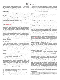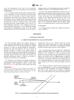5.2 Two optical parameters have the effect of changing image position. The first, lateral displacement, is inherent in any transparency which is tilted with respect to the line of sight. The effect of lateral displacement is constant over distance, and seldom exceeds a fraction of an inch. The second parameter, angular deviation, is usually caused by a wedginess or nonparallelism of the transparency surfaces. The effect of angular deviation is related to the tangent of the angle of deviation, thus the magnitude of the image position displacement increases as does the distance between image and transparency. The quantification of angular deviation is then the more critical of the two parameters. Both parameters are illustrated in Fig. X1.1.