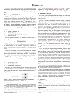 5.2 Eq 1 provides an accurate value of Young’s modulus only for isotropic, non-attenuative, non-dispersive materials of infinite dimensions. For non-isotropic graphite Eq 1 can be modified to take into account the Poisson’s ratios in all directions. As graphite is a strongly attenuative material, the value of Young’s modulus obtained with Eq 1 will be dependent on specimen length. If the specimen lateral dimensions are not large compared with the wavelength of the propagated pulse, then the value of Young’s modulus obtained with Eq 1 will be dependent on the specimen lateral dimensions. The accuracy of the Young’s modulus calculated from Eq 1 will also depend upon uncertainty in Poisson’s ratio and its impact on the evaluation of the Poisson’s factor in Eq 2. However, a value for Young’s modulus Eq 1 or Eq 7) can be obtained for many applications, which is often in good agreement with the value obtained by other more accurate methods, such as in Test Method C747. The technical issues and typical values of corresponding uncertainties are discussed in detail in STP 1578.6