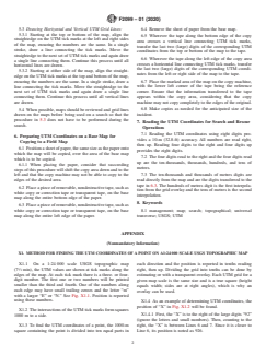 SIGNIFICANCE AND USE 4.1 The base map, field maps, and the UTM grid lines are used during search operations to ensure that field personnel and the command post can accurately communicate specific position information in the search area. 4.2 Section 5 verifies if the UTM grid lines are on the base map or not. If the UTM grid lines are not on the base map, Section 5 describes how to draw them on the map. 4.3 Section 6 establishes how to set up and prepare field maps for personnel to use in the field. 4.4 Section 7 describes the uniform way of determining and communicating UTM coordinates. SCOPE 1.1 This guide describes one method of setting up a Universal Transverse Mercator (UTM) grid system on a base map for transfer to a field map. 1.2 This guide provides a uniform way of communicating UTM coordinates. 1.3 This guide is intended to be used with United States Geological Survey (USGS) 7.5-min quadrangle topographical maps with a scale of 1:24 000, with or without UTM grid lines. 1.4 The values stated in SI units are to be regarded as standard. No other units of measurement are included in this standard. 1.5 This standard does not purport to address all of the safety concerns, if any, associated with its use. It is the responsibility of the user of this standard to establish appropriate safety, health, and environmental practices and determine the applicability of regulatory limitations prior to use. 1.6 This international standard was developed in accordance with internationally recognized principles on standardization established in the Decision on Principles for the Development of International Standards, Guides and Recommendations issued by the World Trade Organization Technical Barriers to Trade (TBT) Committee.